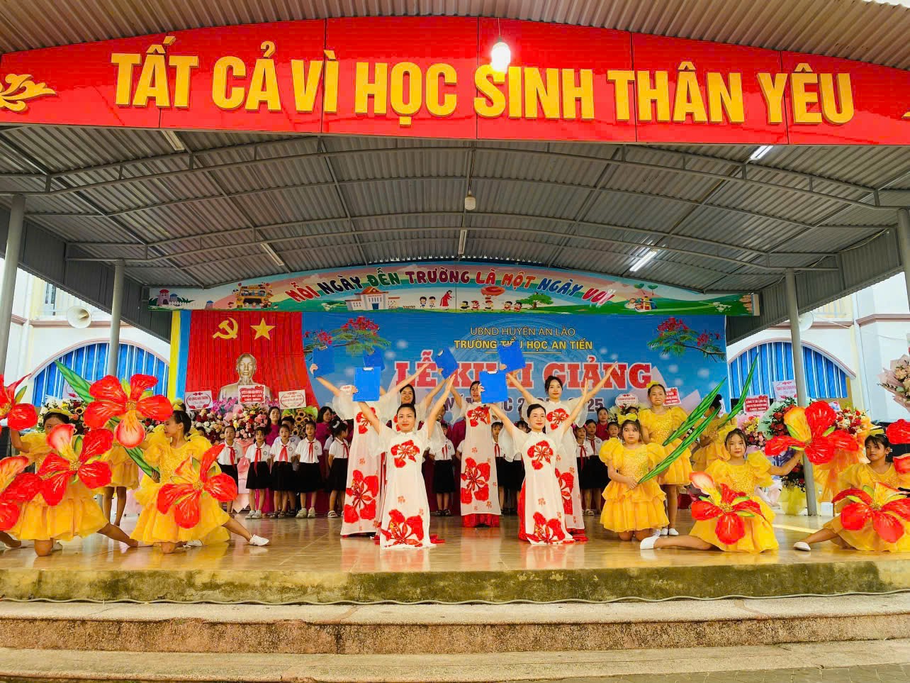 Hòa trong không khí vui tươi phấn khởi của mùa thu- mùa tựu trường. Đúng 8 giờ ngày 05/9/2024, thày và trò trường Tiểu học An Tiến long trọng tổ chức Lễ khai giảng năm học 2024-2025. Rất vinh dự cho thầy và trò nhà trường được đón: Ông Đỗ Văn Thưởng - Ủy viên BTV Huyện ủy- Chỉ huy trưởng BCH Quân sự huyện An Lão; Ông Ninh văn Tỉnh - Phó trưởng phòng Nội vụ huyện; các ông bà địa diện lãnh đạo Đảng uỷ- HĐND-UBND-UBMTTQVN;, Hội Khuyến học, Hội Cựu Giáo chức xã An Tiến; Các đơn vị đóng quân trên địa bàn xã; các doanh nghiệp, đơn vị kết nghĩa với nhà trường; Các đồng chí nguyên là cán bộ quản lý nhà trường; Ban đại diện CMHS nhà trường , trưởng ban đại diện CMHS các lớp; các đồng chí CBGVNV và 888 em học sinh đã về dự đông đủ.