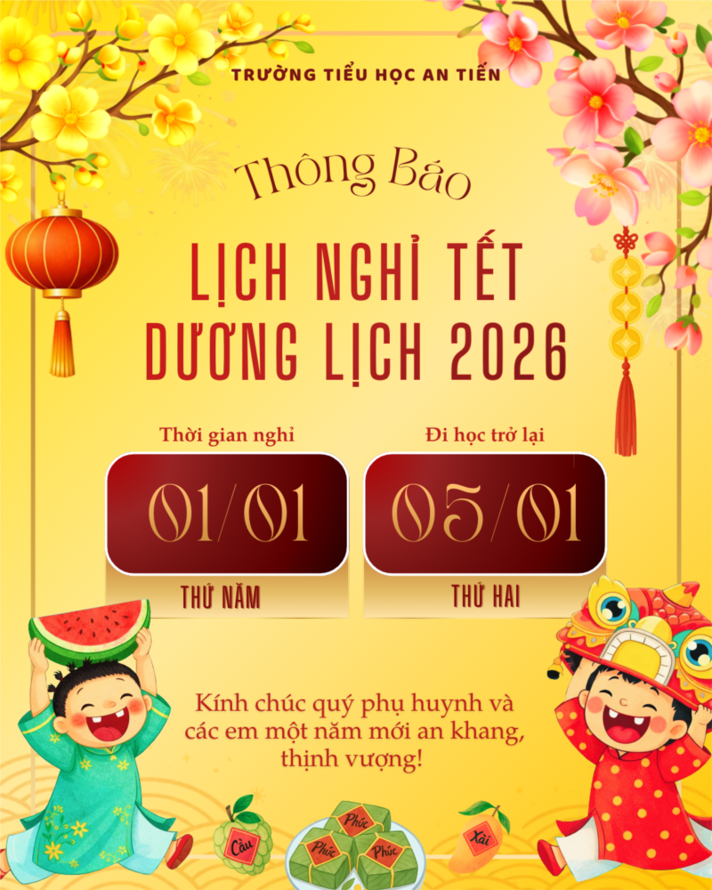 🏫Trường Tiểu học An Tiến trân trọng thông báo tới toàn thể quý phụ huynh và các em học sinh về lịch nghỉ Tết Dương lịch năm 2026 như sau: