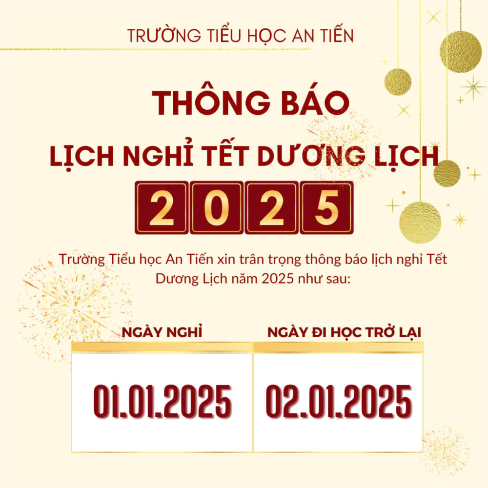 Trường Tiểu học An Tiến trân trọng gửi tới CBGV - NV toàn trường cùng Quý PH và HS lịch nghỉ Tết Dương Lịch năm 2025 như sau: