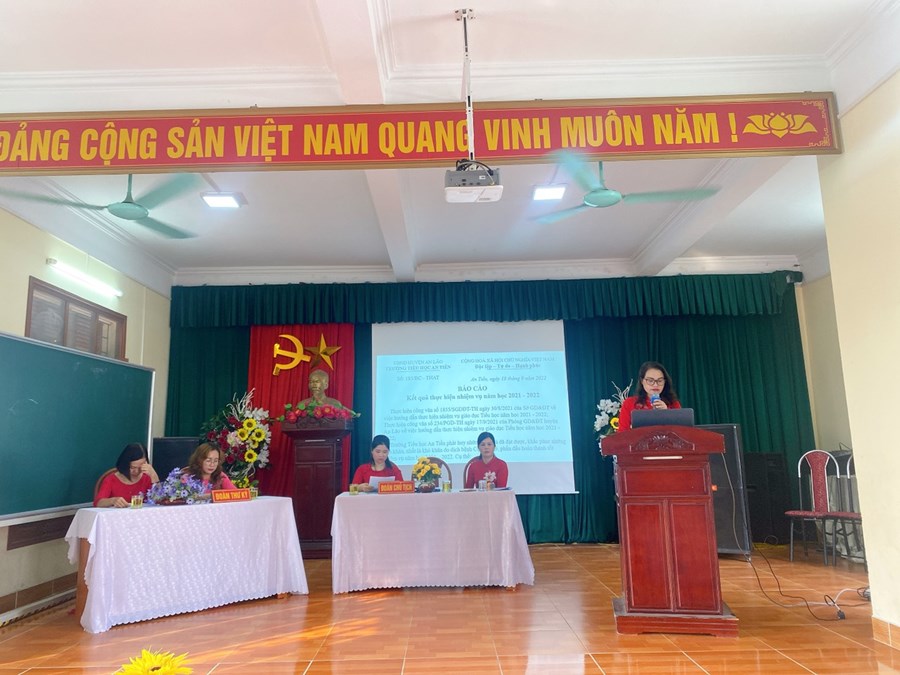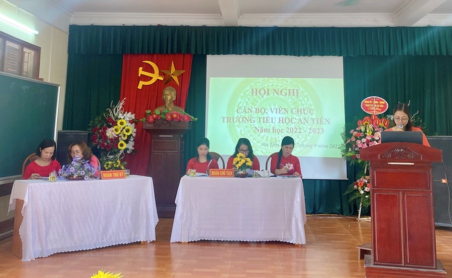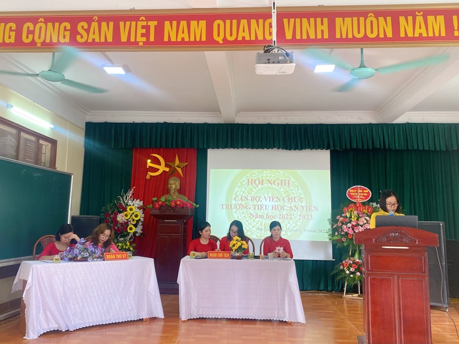 Thực hiện HD liên tịch số 183/ HDLT của Phòng GDĐT - LĐLĐ huyện An Lão về hướng dẫn tổ chức Hội nghị cán bộ viên chức trong các trường học năm học: 2022- 2023. Sáng ngày 27/ 9/ 2022 trường Tiểu học An Tiến long trọng tổ chức Hội nghị viên chức. Tới dự với nhà trường có bà Nguyễn Thị Doanh - Chuyên viên Phòng Giáo dục huyện An Lão. Ông Bùi Văn Bút - Chủ tịch UBND xã An Tiến cùng đại biểu đại diện cho HĐND - UBND - MTTQ Việt Nam xã An Tiến.