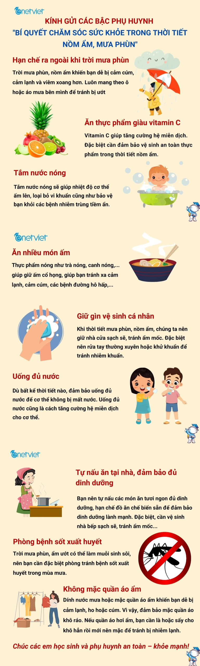 - Ban giám hiệu nhà trường rất mong các em học sinh giữ gìn sức khỏe, chú ý vấn đề vệ sinh, đảm bảo môi trường sống sạch sẽ, khô thoáng. Các em học sinh và quý phụ huynh tham gia giao thông cần cẩn thận, tránh trơn trượt đáng tiếc.